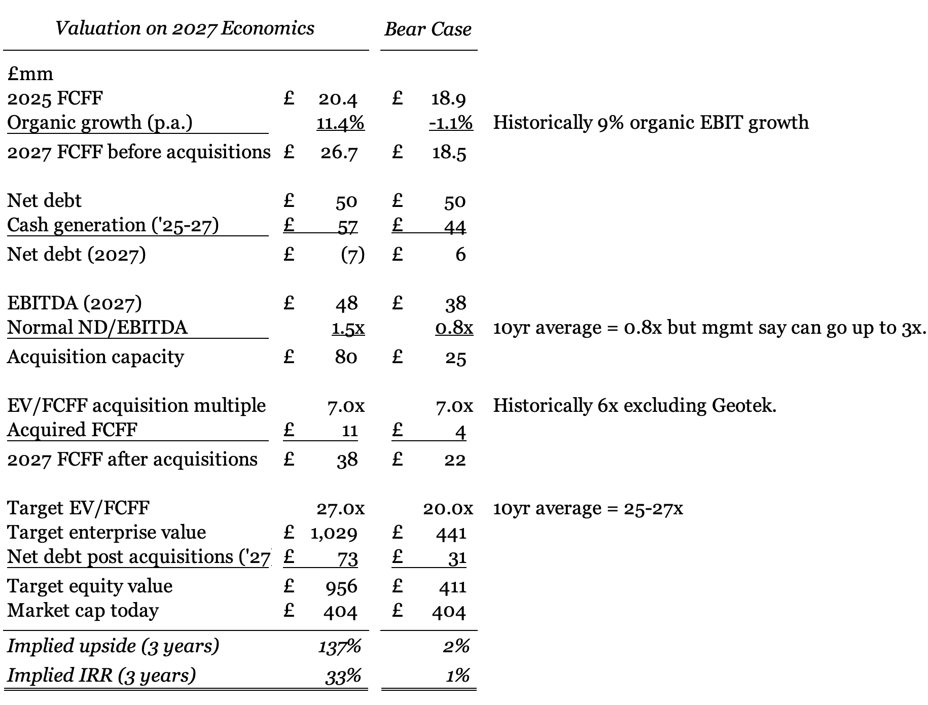 Overall, these scenarios suggest the risk/reward on Judges today is very attractive. The stock is trading at what I think is a reasonable Bear case for intrinsic value over the next three years. While the size of US college spending cuts has certainly surprised me, there should be a substantial reversal over the next few years as we get resolutions. Judges’ problems with Geotek and spending in China in 2023-24 have largely reversed, and lower valuation multiples in the sector may make acquisitions easier.