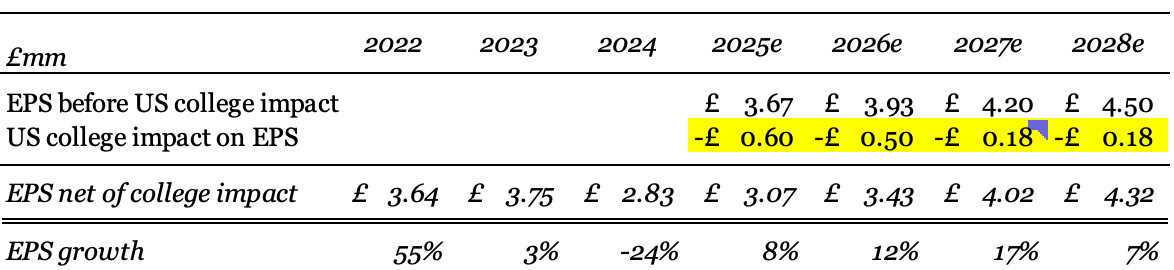 As we increasingly get resolutions uncertainty should reduce significantly, like we are seeing with trade deals. In my base case I am now modelling an 80% recovery in college spending levels in 2027 vs 2024, i.e. a 20% permanent cut, which I assume drops through to a 70% recovery in lost EPS. This will likely be backend loaded unless we get significantly more resolutions before the new academic year begins in September.
