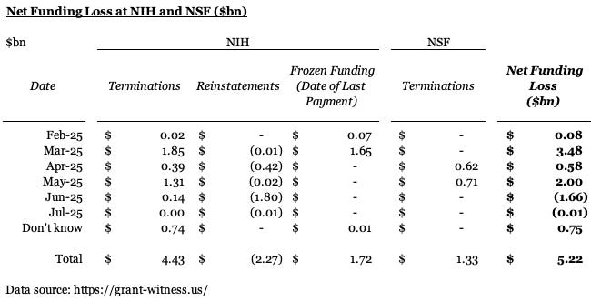 A website called Grant Witness has been set up to track the termination of grants. The website is not perfect as it partly relies on scientists self-reporting cuts, but the data is helpful. The table below shows, by month, the termination of grants at the NIH, reinstatements of terminated grants, grants that were already authorized but are now frozen, and terminations at the NSF: