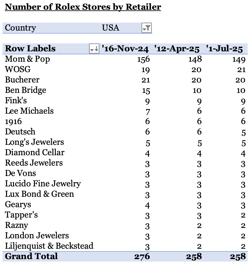 Meanwhile, WOSG’s share of Rolex sales in the US is growing. Data from tracking the list of stores on Rolex's website suggests that the total number of Rolex stores in the US declined from 276 in November 2024 to 257 in April 2025 and 253 in July 2025, as Rolex continued its decades-long policy of shrinking the store count and reallocating watches to the best stores.
