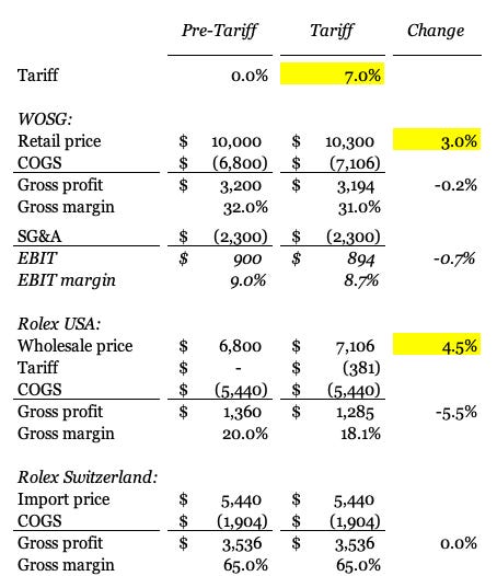 Rolex raised US prices by 3% on May 1 and cut retailer gross margins by 1ppt, essentially completely offsetting the tariff increase while keeping Watches of Switzerland's gross profits flat in absolute dollars.