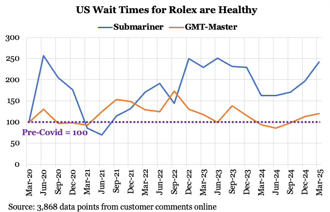 My customer data suggests that waitlists in the US remained healthy coming into Liberation Day, which provides a large buffer to sales and matches Watches of Switzerland's comments in February that they were seeing continued momentum. Data from WatchCharts also showed that Rolex secondary prices increased in Q1. Premiums for Rolex are now higher than any brand, including Patek and AP.