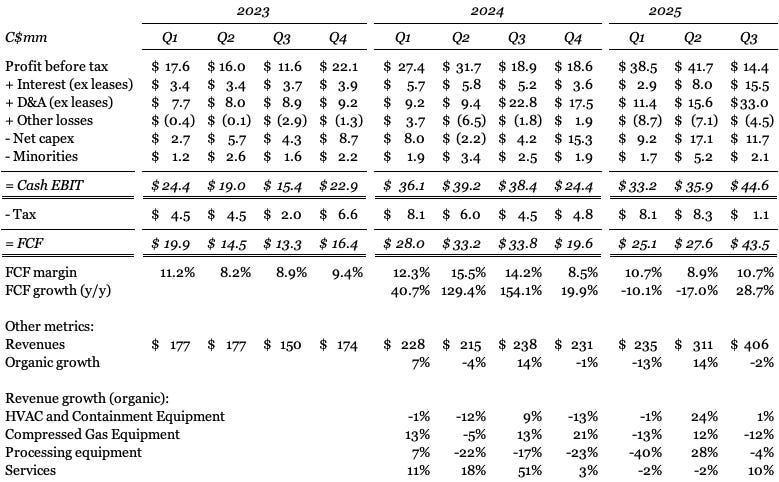 At TerraVest’s normal acquisition multiples of 11x FCF and 7x post-restructuring, that would imply acquired FCF of C$41mm post-restructuring and total company FCF of C$215mm.